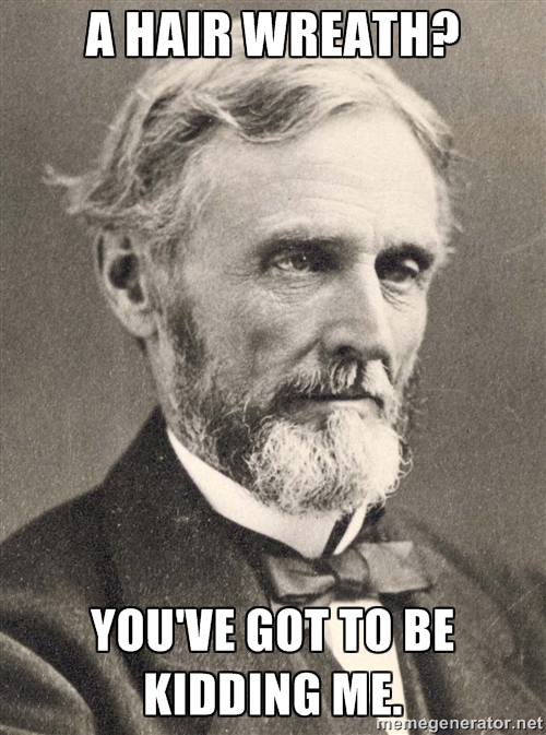 One particularly fascinating story involved the display of a “hair wreath” at the Cotton States Exposition in Atlanta in 1895. Jeff Davis’s hair was at the center of this wreath and was interwoven with the hair of several other Confederate heroes including Robert E. Lee, Raphael Semmes, Frank Cheatham, Nathan Bedford Forrest, D. H. Hill, Joseph E. Johnston, Edmund Kirby Smith, Bushrod Johnson, and James Longstreet–making it a literal treasure trove of Confederate hair. (I was unable to locate an image of the hair wreath. My apologies.)